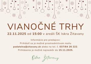 22.11.2025 o 15:00 hod. v areály ŠK Žitavany. Predajcovia sa môžu prihlásiť na tel. čísle 037/64 26 222 alebo prostredníctvom mailu podatelna@zitavany.sk, najneskôr do 15.11.2025