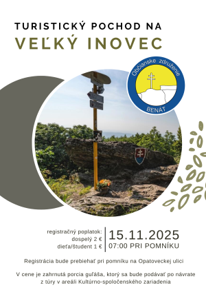 „Občianske združenie Benát vás pozýva na tradičný turistický pochod po trase: Žitavany – Benát – Krivá - Veľký Inovec -Žitavany. Výstup uskutoční v sobotu, 15. novembra. Registrácia bude o 7.00 pri pomníku na ulici Opatoveckej. Registračný poplatok pre dospelých je 2 €, pre deti a študentov 1 €.