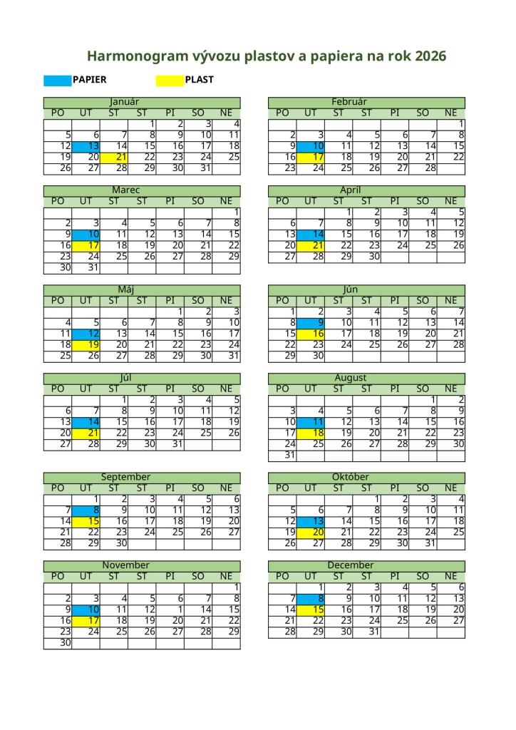 Harmonogram vývozu plastov a papiera na rok 2026