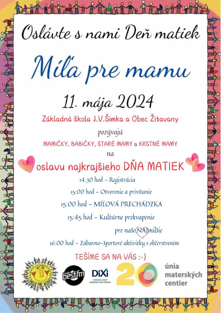 Základná škola J.V.Šimka a obec Žitavany Vás pozývajú na oslavu dňa matiek 11.05.2024 do areály školy. Ďalšie informáciu sú v priloženom plagáte.